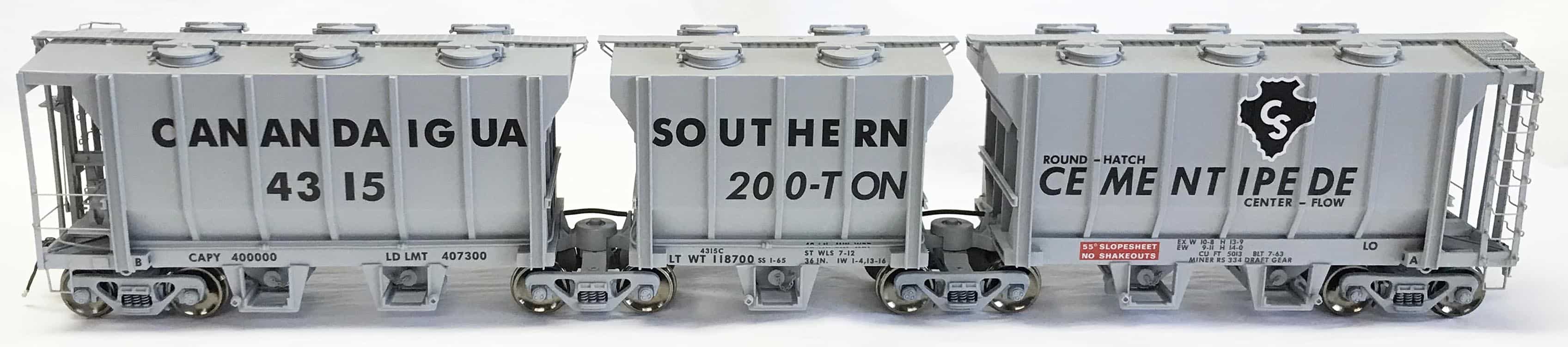 The late John Armstrong, noted for his large O scale, outside-rail layout and numerous layout design books, designed this one-of-a-kind articulated covered hopper he dubbed "The Cementipede". Built from carstock and wood sometime in the early to mid-1960s, it reflected various attempts by some railroads to greatly increase a car's capacity while marketing them as a single car, thus escaping tonnage rate regulations of the era. This concept "peaked" in 1991 after Santa Fe commissioned three 5-unit Aluminum articulated covered hoppers and named the design "Super Hopper". BNSF retired all three in 2017 but one, No. 390002, has been saved by the Oklahoma Railway Museum.