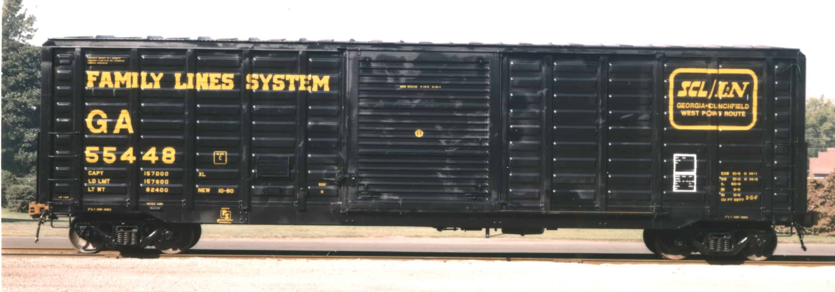 Family Lines System cars (10-post with waffles) were built in 1980 and lettered in this scheme with SCL (400 cars), Georgia (75), and Clinchfield (150) reporting marks. Most were in operation under subsequent Seaboard System and many were repainted/renumbered CSX.